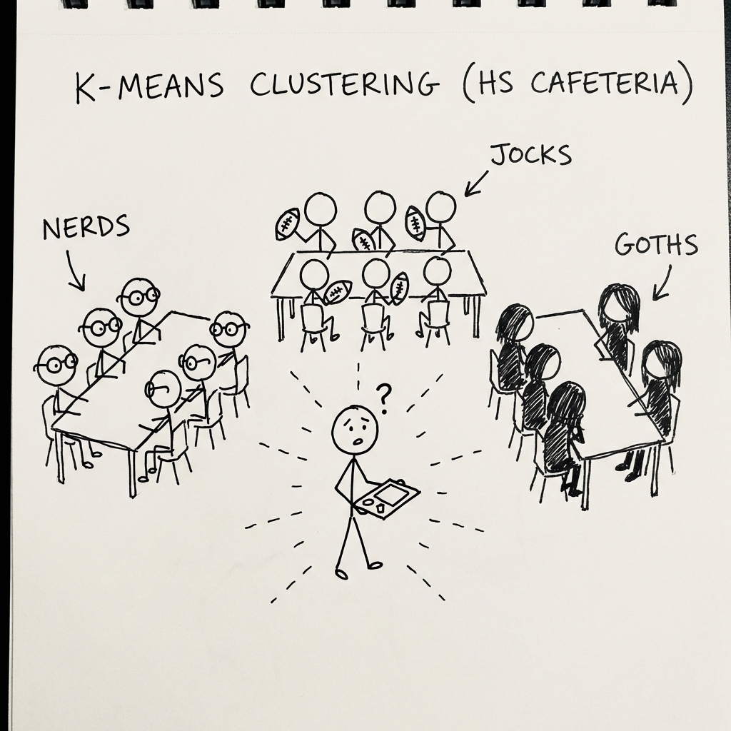 Krandom tables (centroids). Let's say K=3 (Jocks, Nerds, Goths). - Assignment: Every student sits at the table they are most similar to.